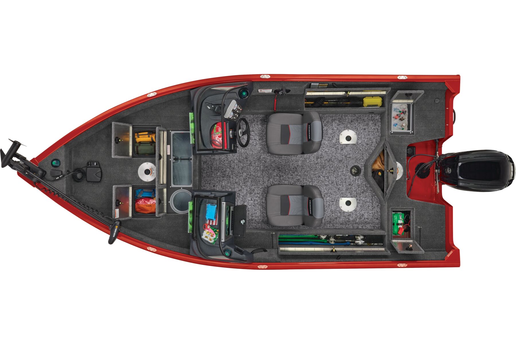 The TRACKER PRO GUIDE V-16 WT packs a punch in a compact, Deep V hull design. The walk-thru windshield shields you from the elements, ensuring comfort in all conditions. With three fishing seats and six customizable setups, the PRO GUIDE V-16 WT is ready for your whole crew. The Deep V hull is sdesigned for smooth, dry performance and peak edge-to-edge stability. It has space galore, so you can haul all your gear with ease. Up front is a standard Minn Kota trolling motor with a livewell/baitwell and twin storage boxes while the console features a Garmin Striker 4 color fishfinder with a full gauge setup and smooth, reliable steering. Rounding out the package are a custom-fitted trailer and reliable, economical four stroke Mercury power.