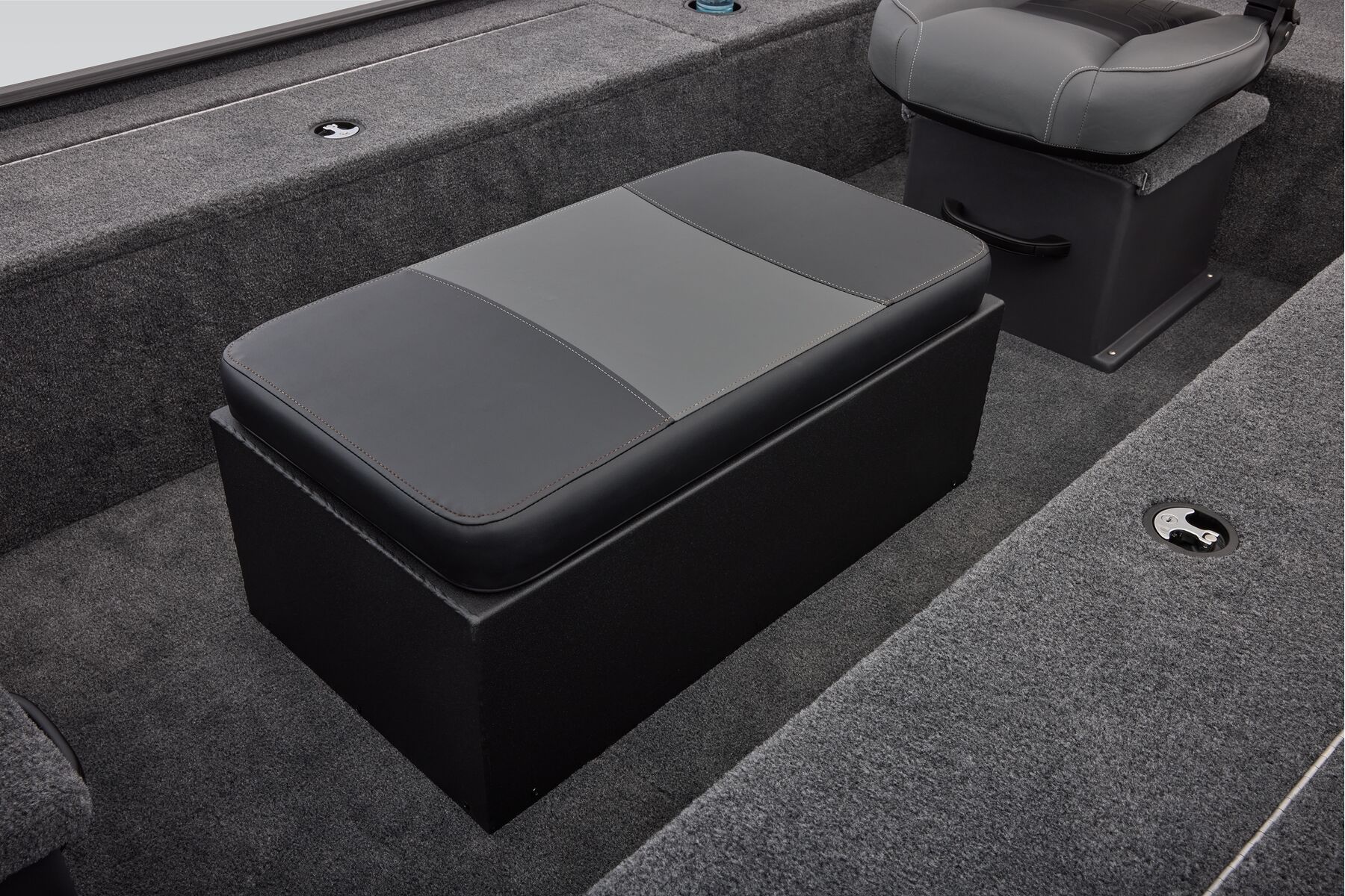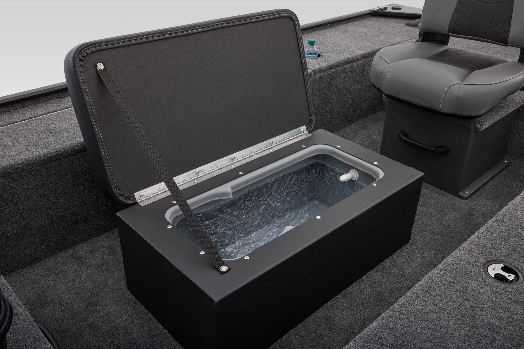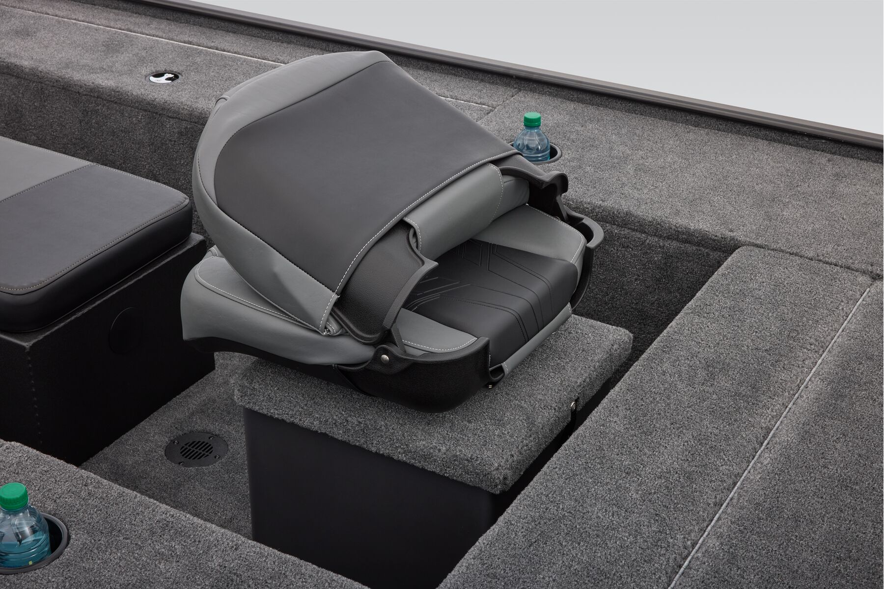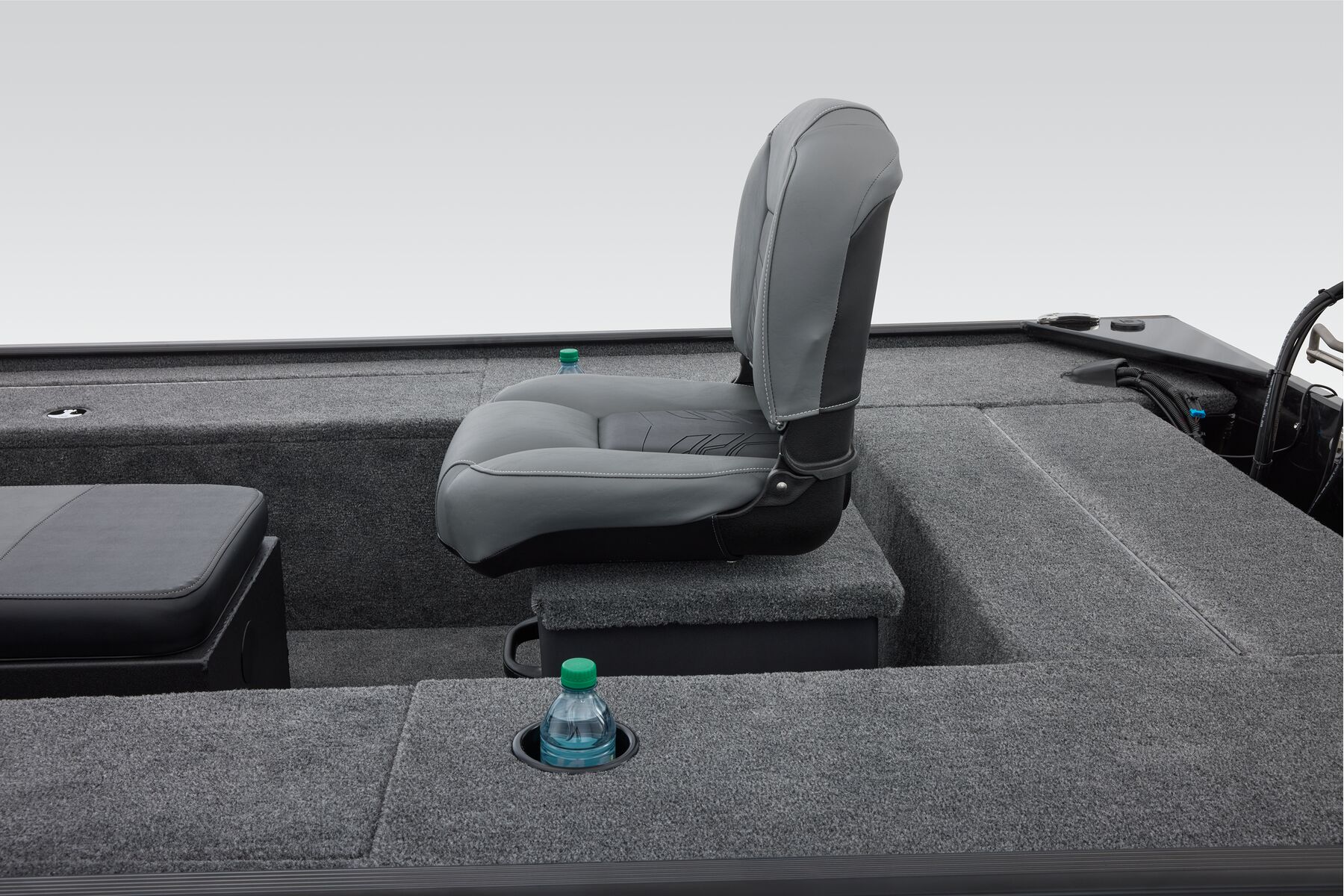 The cockpit’s well-designed layout provides ample space for you and a friend or two to carry all your essentials for a successful day on the water. A center livewell, topped with a cushioned seat for two, offers convenient fish storage, while the rear fold-down fishing seat conceals additional storage options. Powering this reliable vessel is a smooth Mercury® engine, engineered for efficient and economical performance.