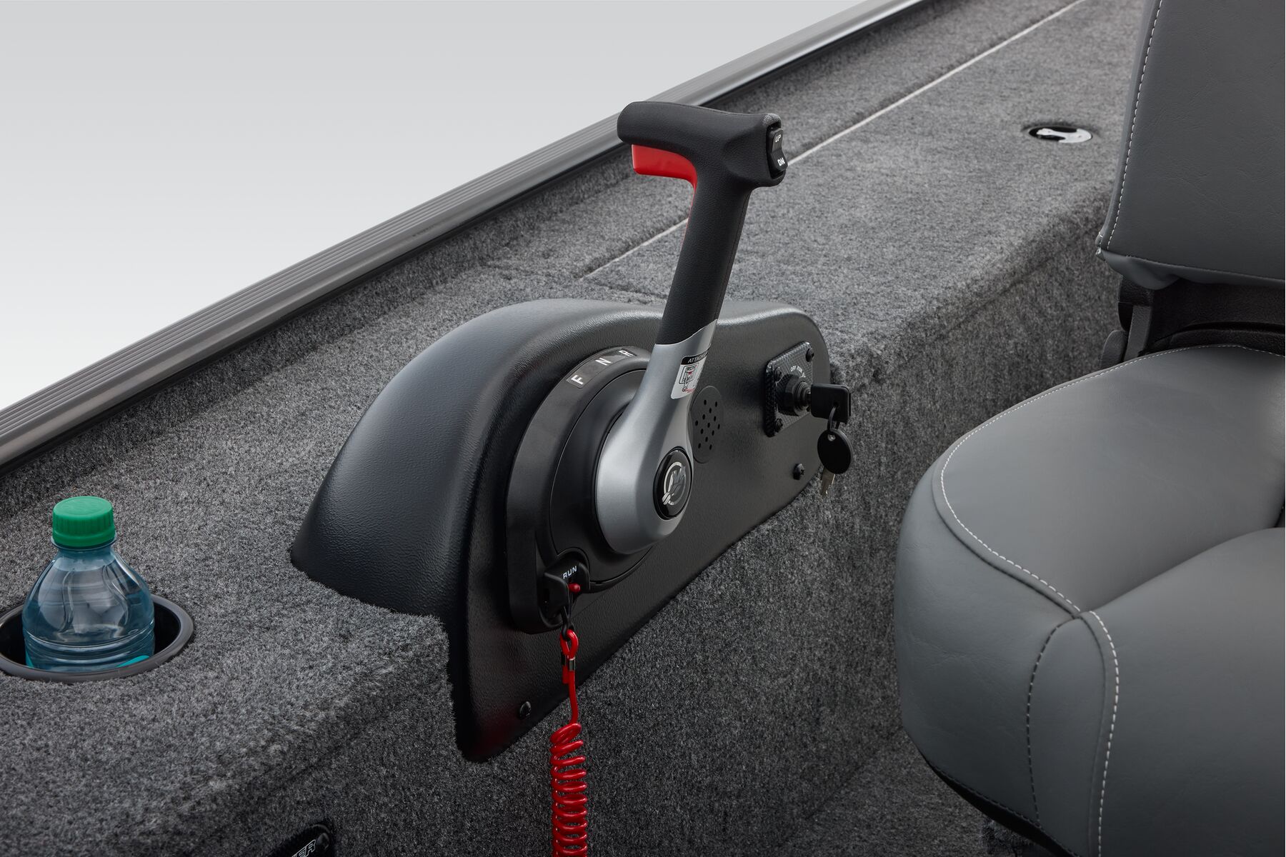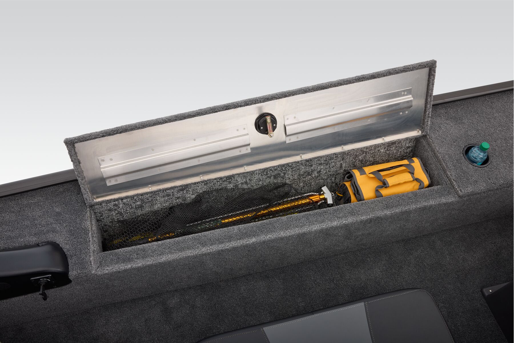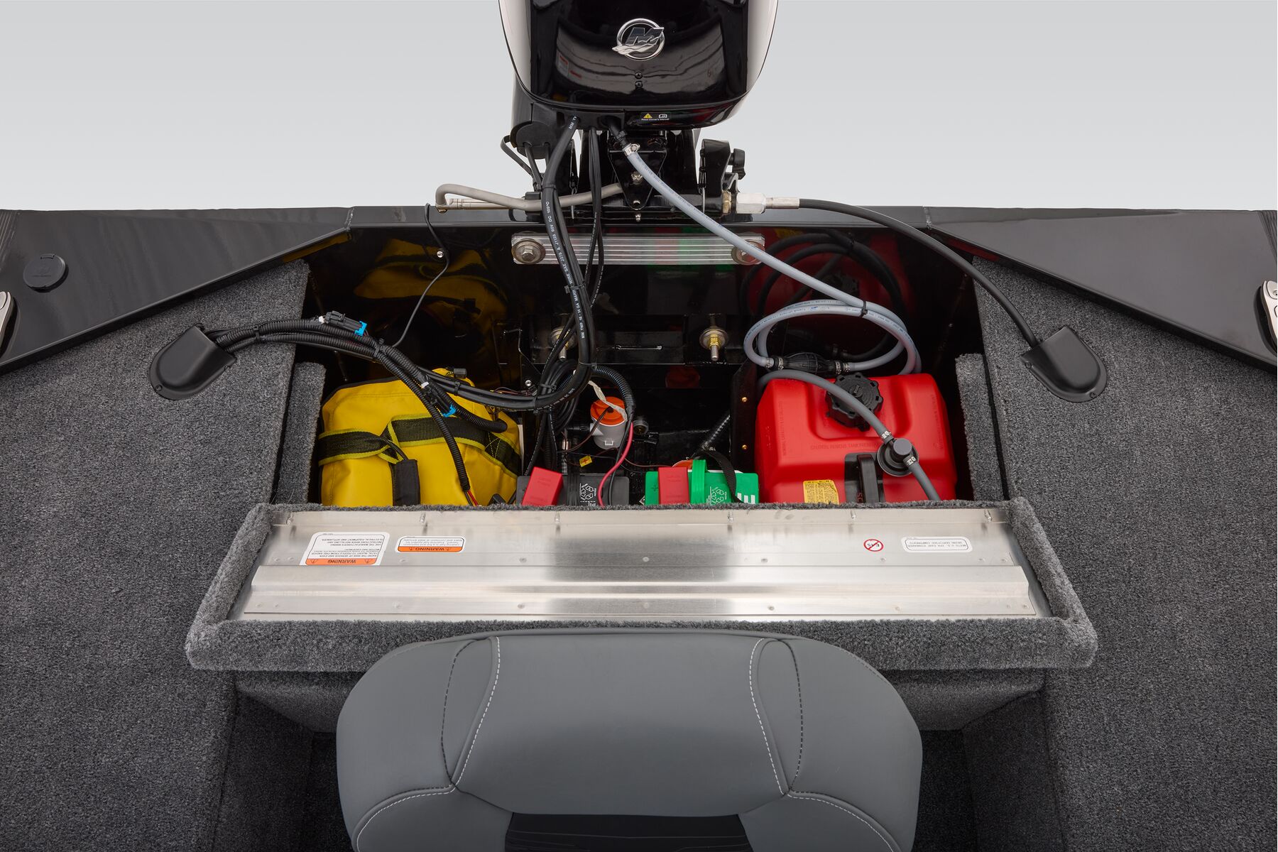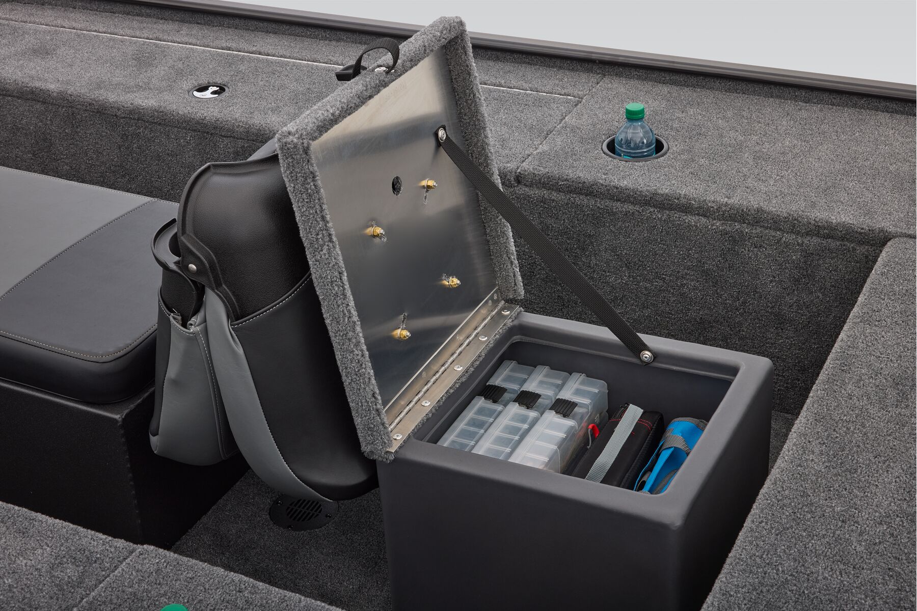 The cockpit’s well-designed layout provides ample space for you and a friend or two to carry all your essentials for a successful day on the water. A center livewell, topped with a cushioned seat for two, offers convenient fish storage, while the rear fold-down fishing seat conceals additional storage options. Powering this reliable vessel is a smooth Mercury® engine, engineered for efficient and economical performance.