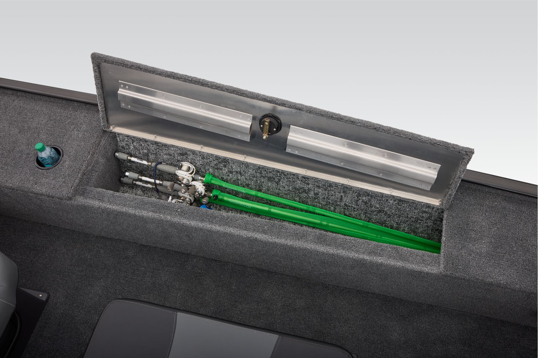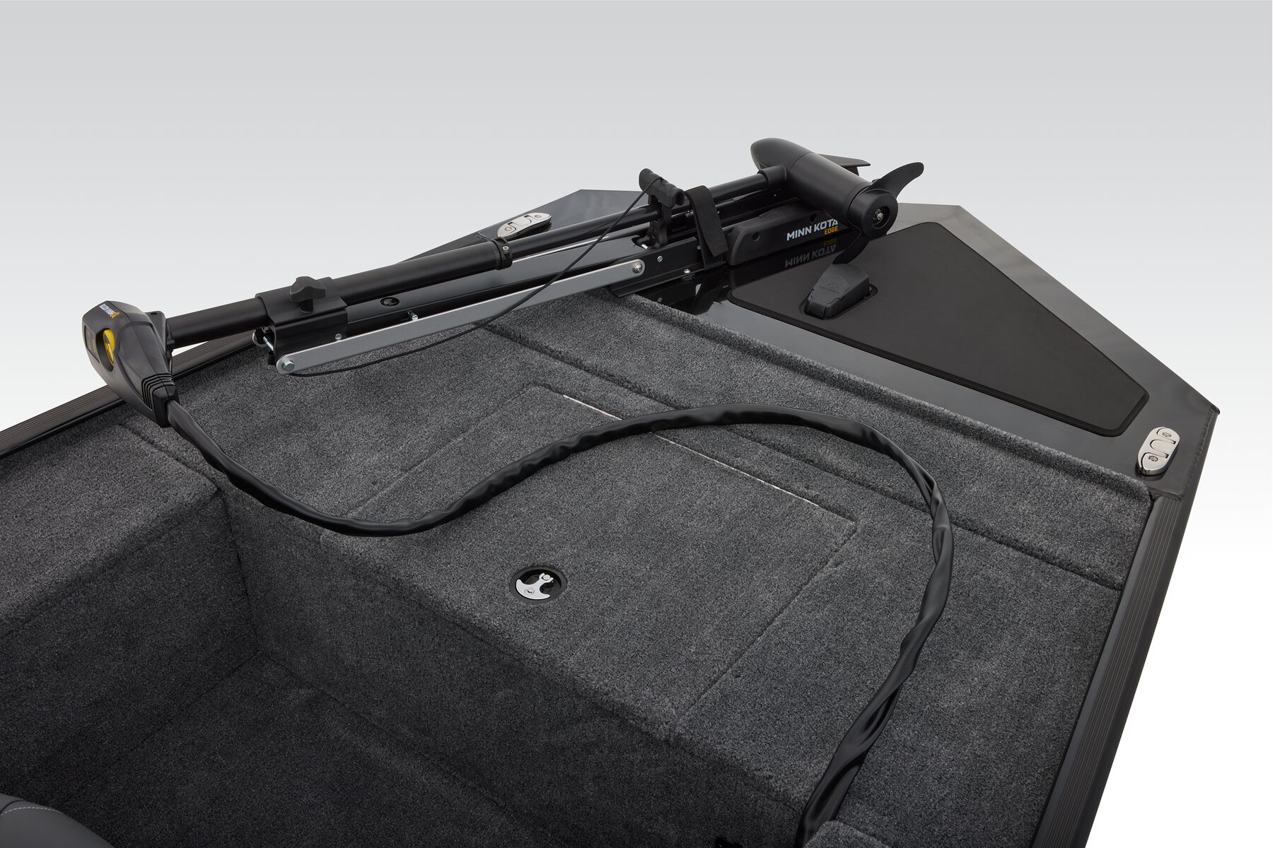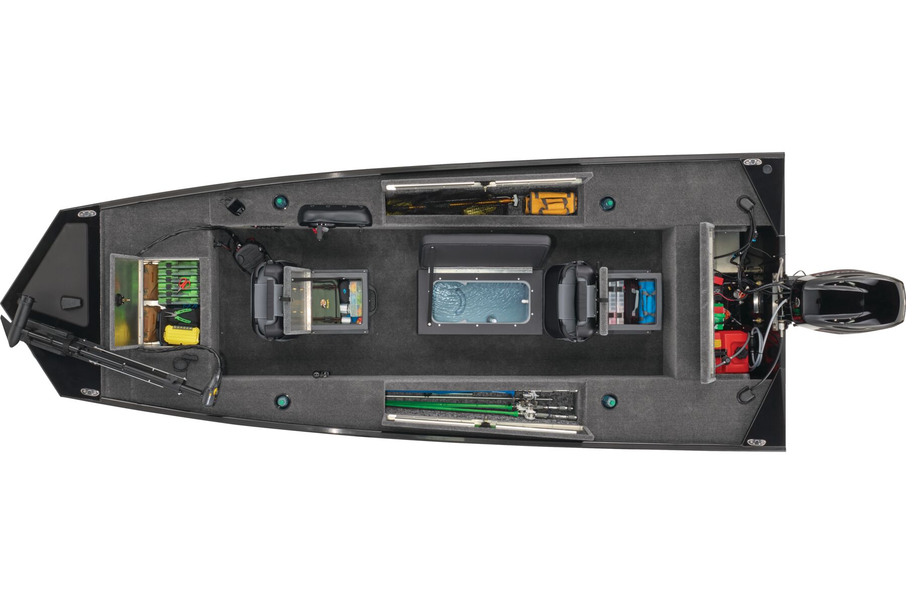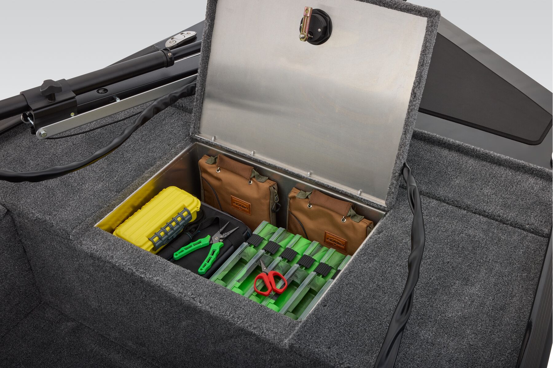 The cockpit’s well-designed layout provides ample space for you and a friend or two to carry all your essentials for a successful day on the water. A center livewell, topped with a cushioned seat for two, offers convenient fish storage, while the rear fold-down fishing seat conceals additional storage options. Powering this reliable vessel is a smooth Mercury® engine, engineered for efficient and economical performance.