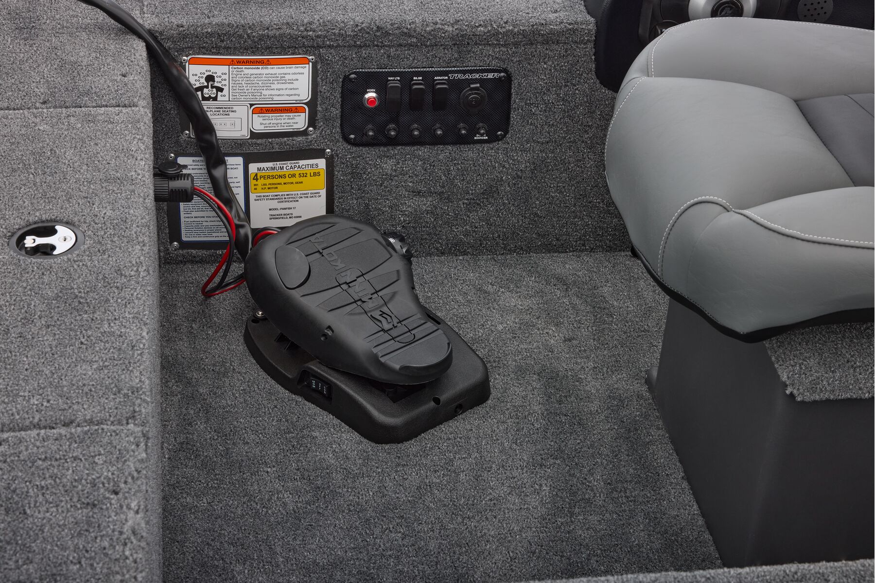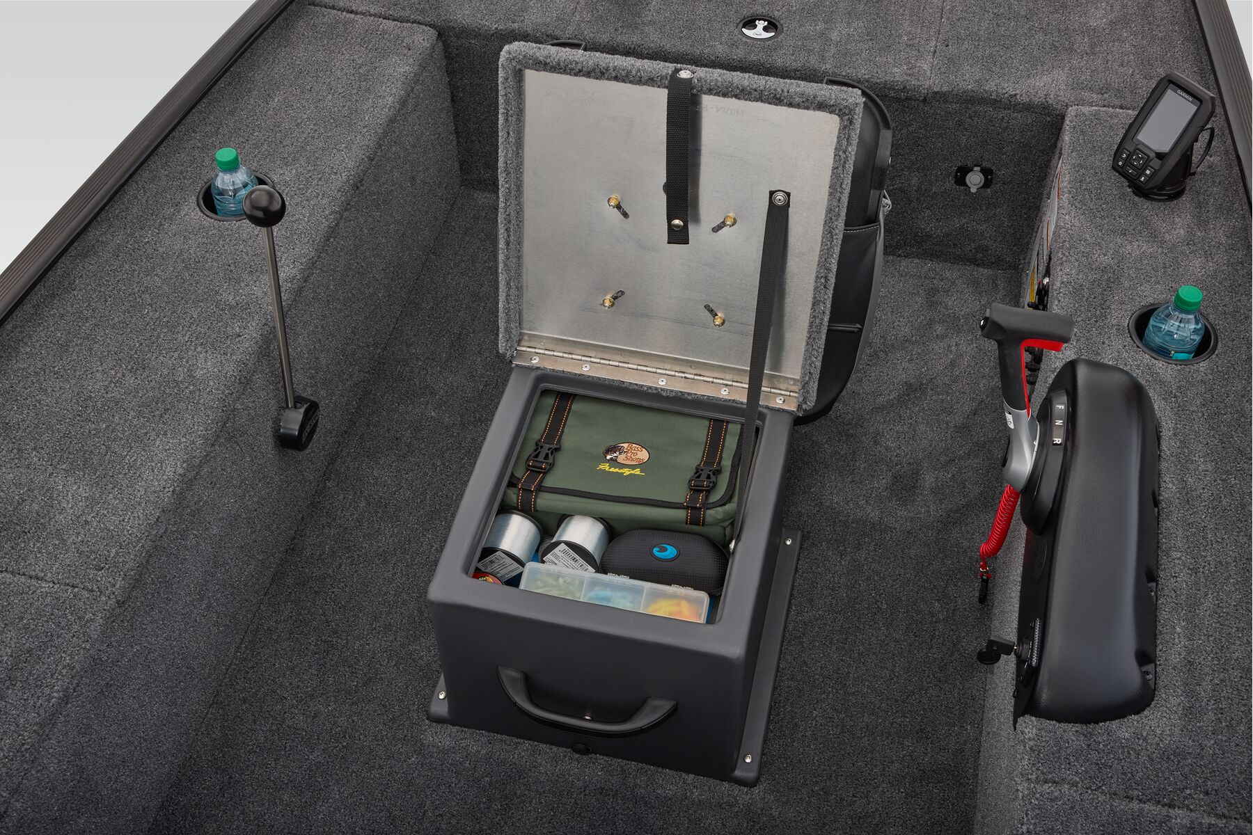 Inside, the Panfish 17 offers a practical and budget-friendly interior. The bow driver’s station includes a throttle and steering stick, complemented by a standard fishfinder and electronics to help you locate and stay on the fish. A large bow storage compartment keeps your gear organized, accessible, and protected from the elements.