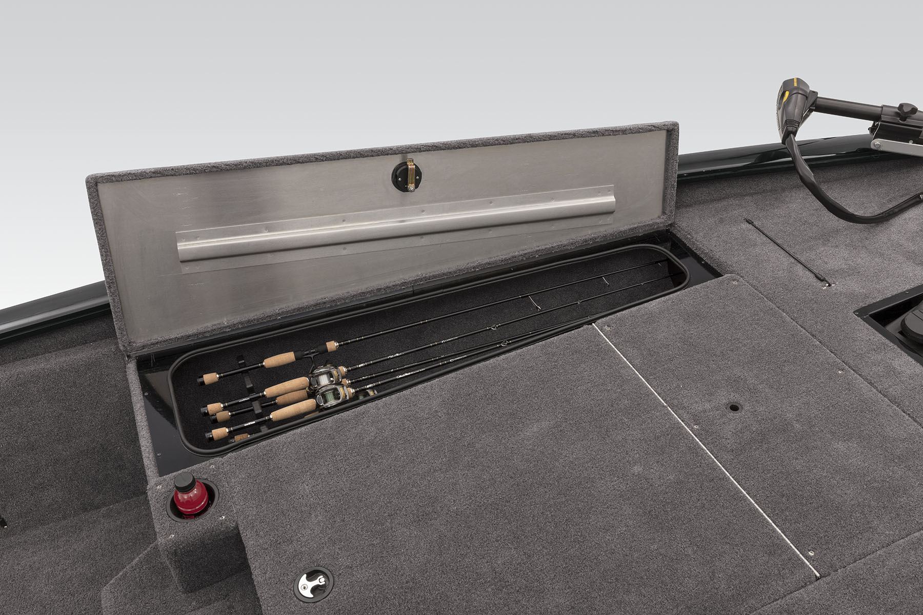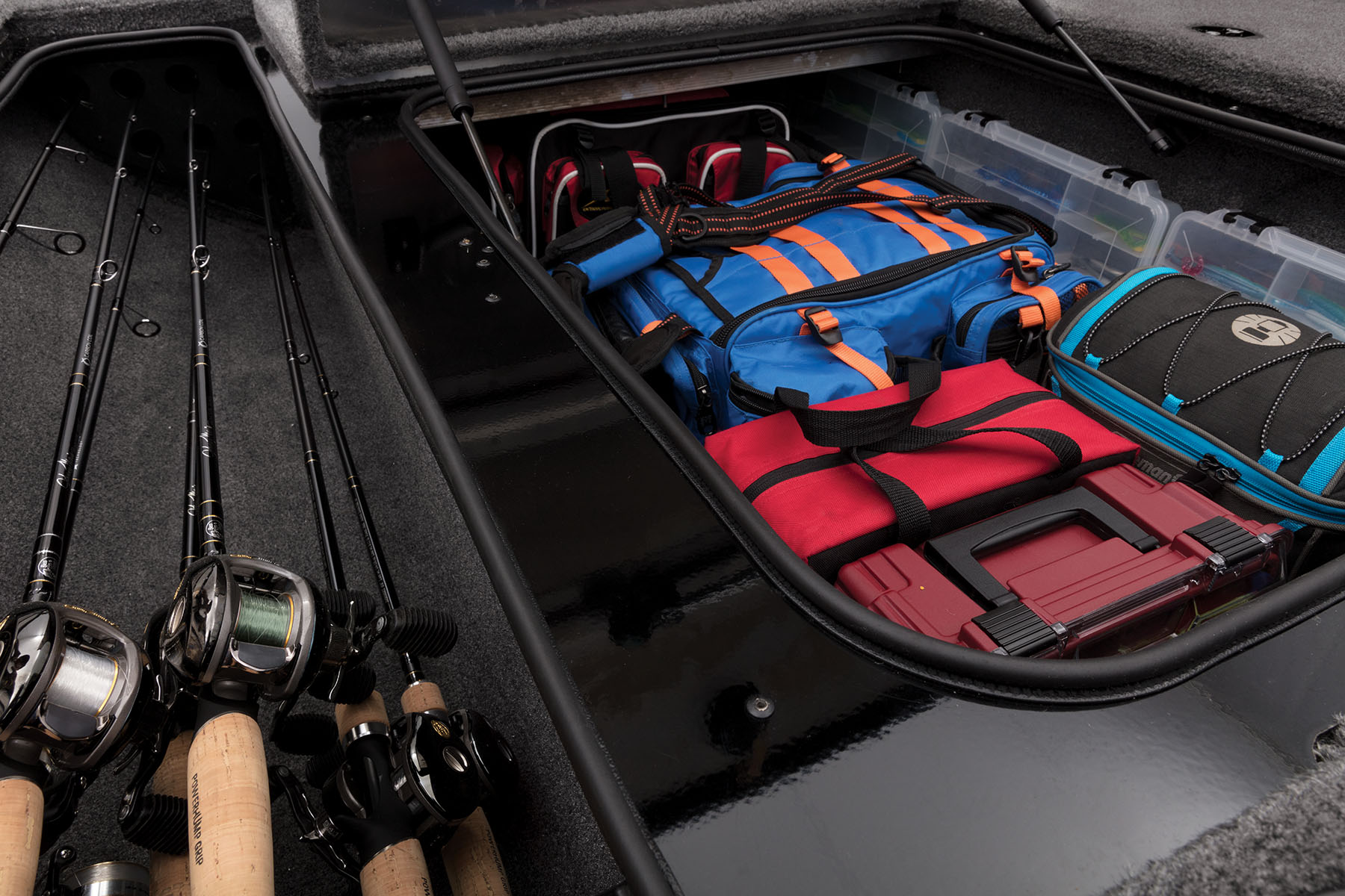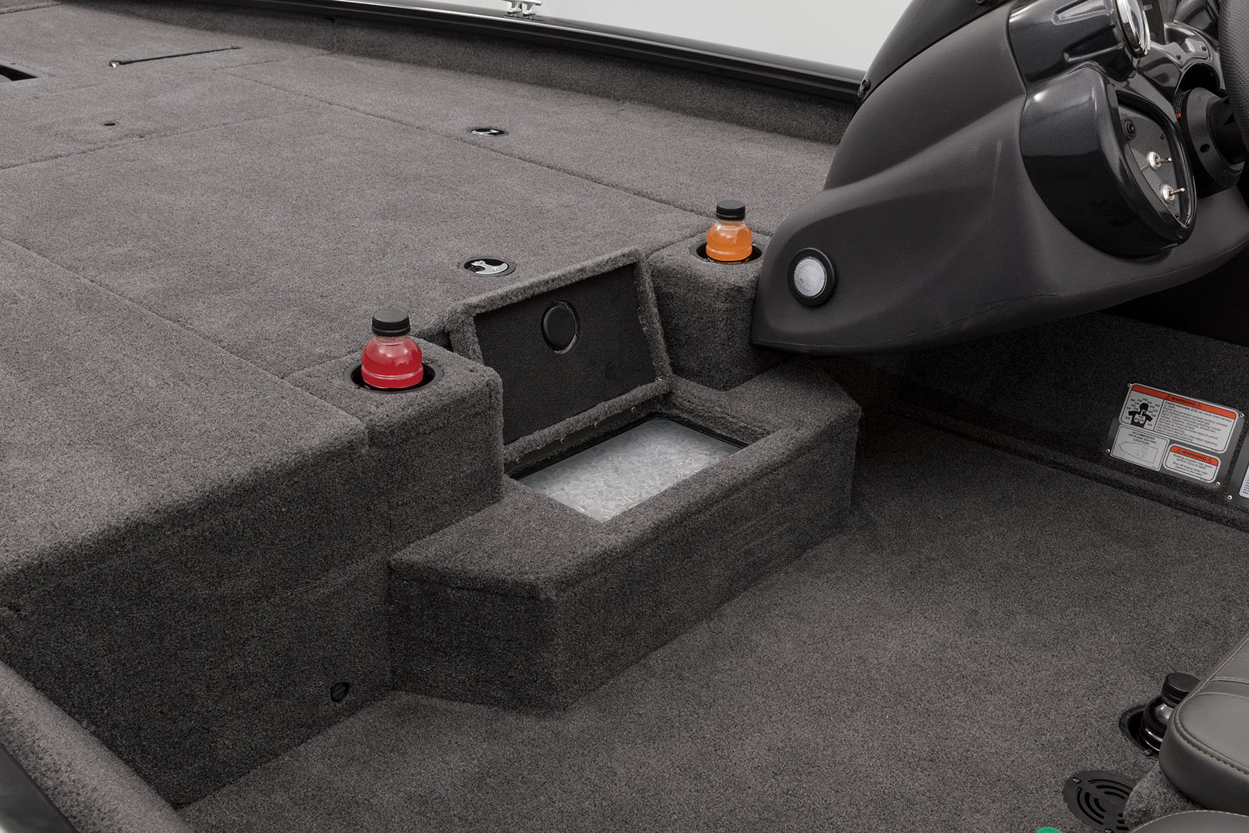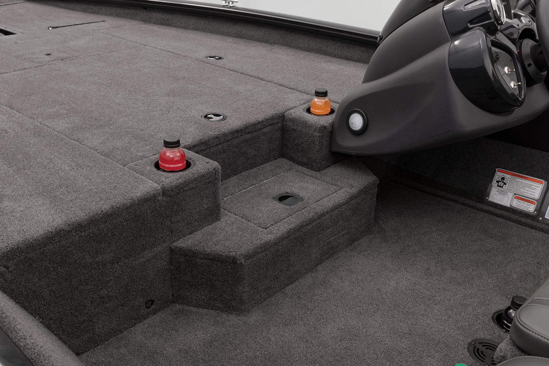 The TRACKER® PRO TEAM™ 190 TX sports a tournament-style deck layout—port and starboard 7’ rod boxes with tip organizers, a giant center bow tackle box and bag organizer, a cooler in the step up to the bow deck flanked by two drink holders.