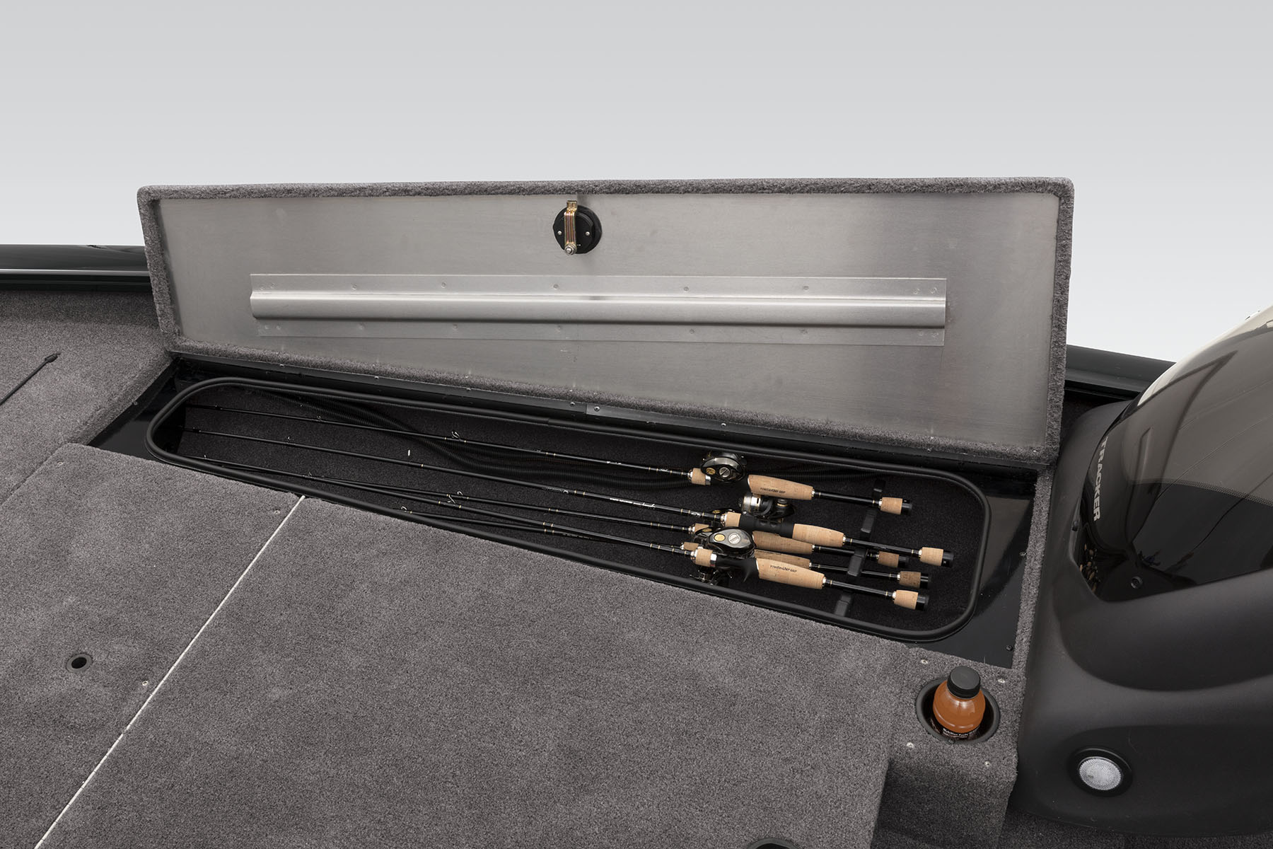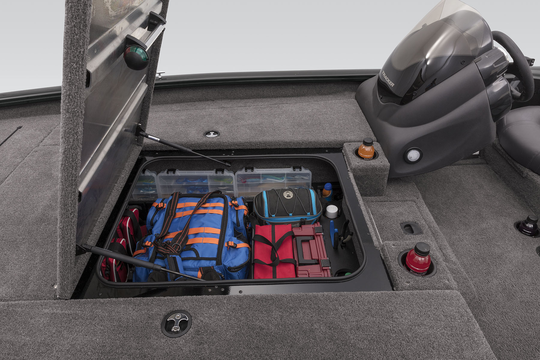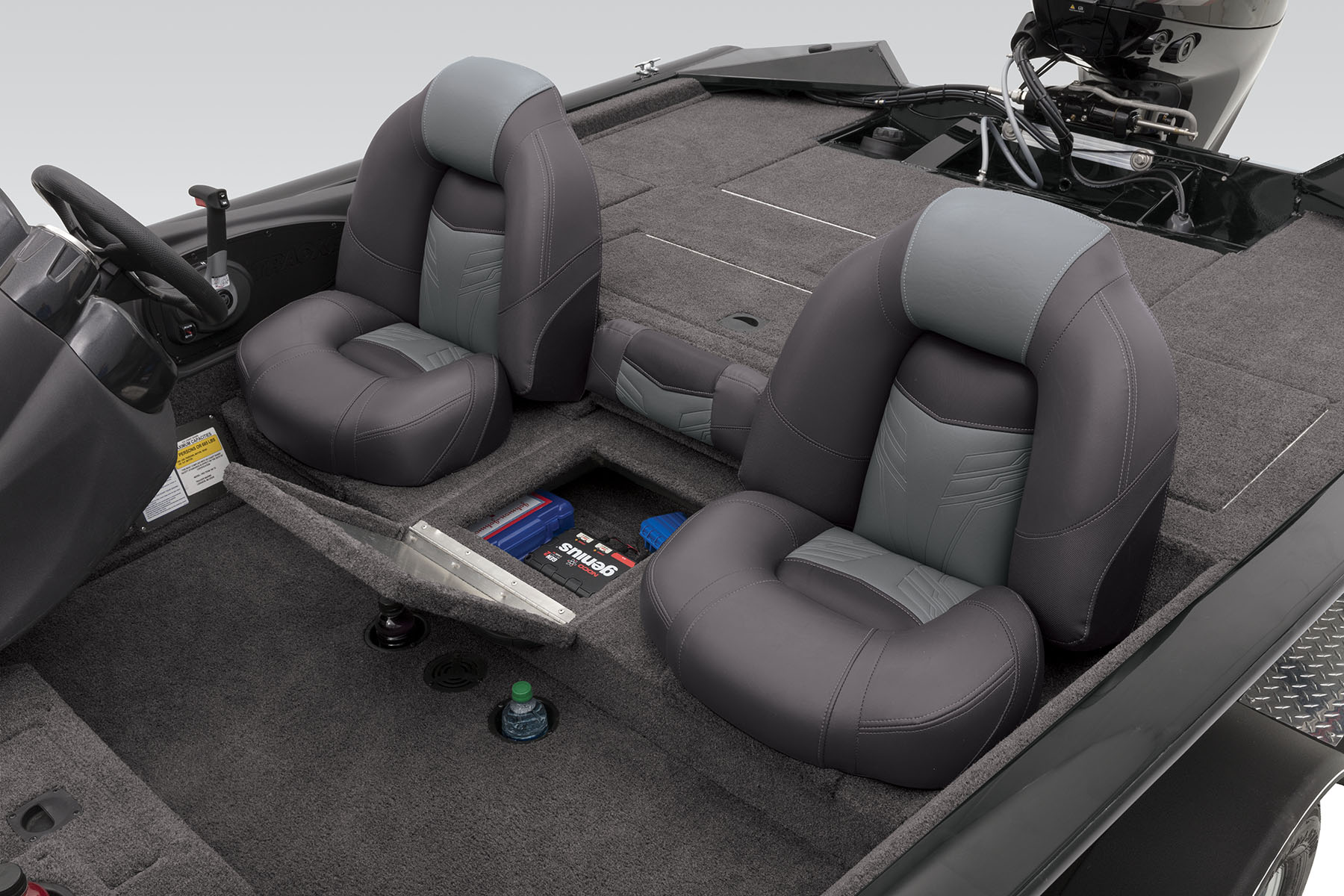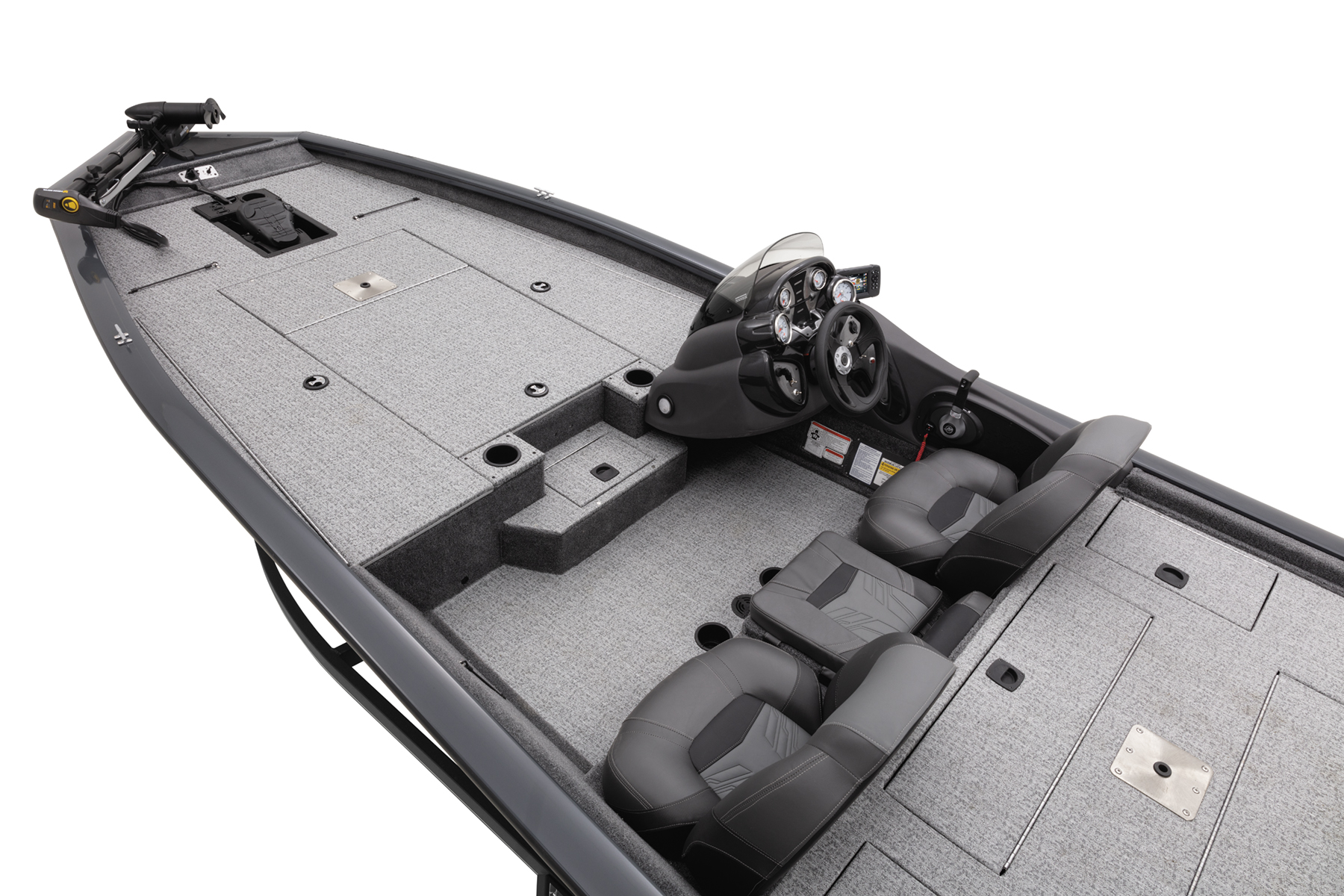 The TRACKER® PRO TEAM™ 190 TX sports a tournament-style deck layout—port and starboard 7’ rod boxes with tip organizers, a giant center bow tackle box and bag organizer, a cooler in the step up to the bow deck flanked by two drink holders.