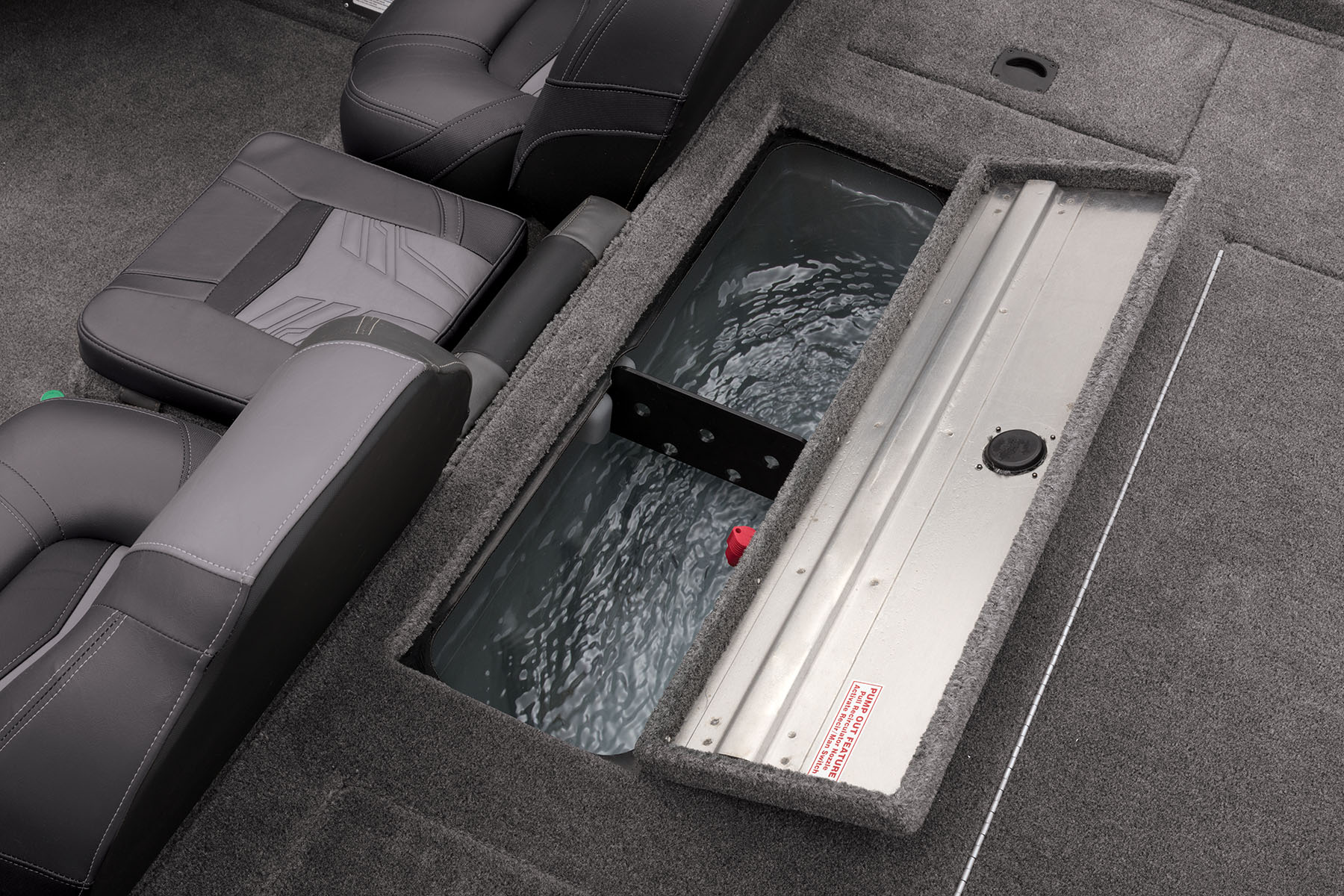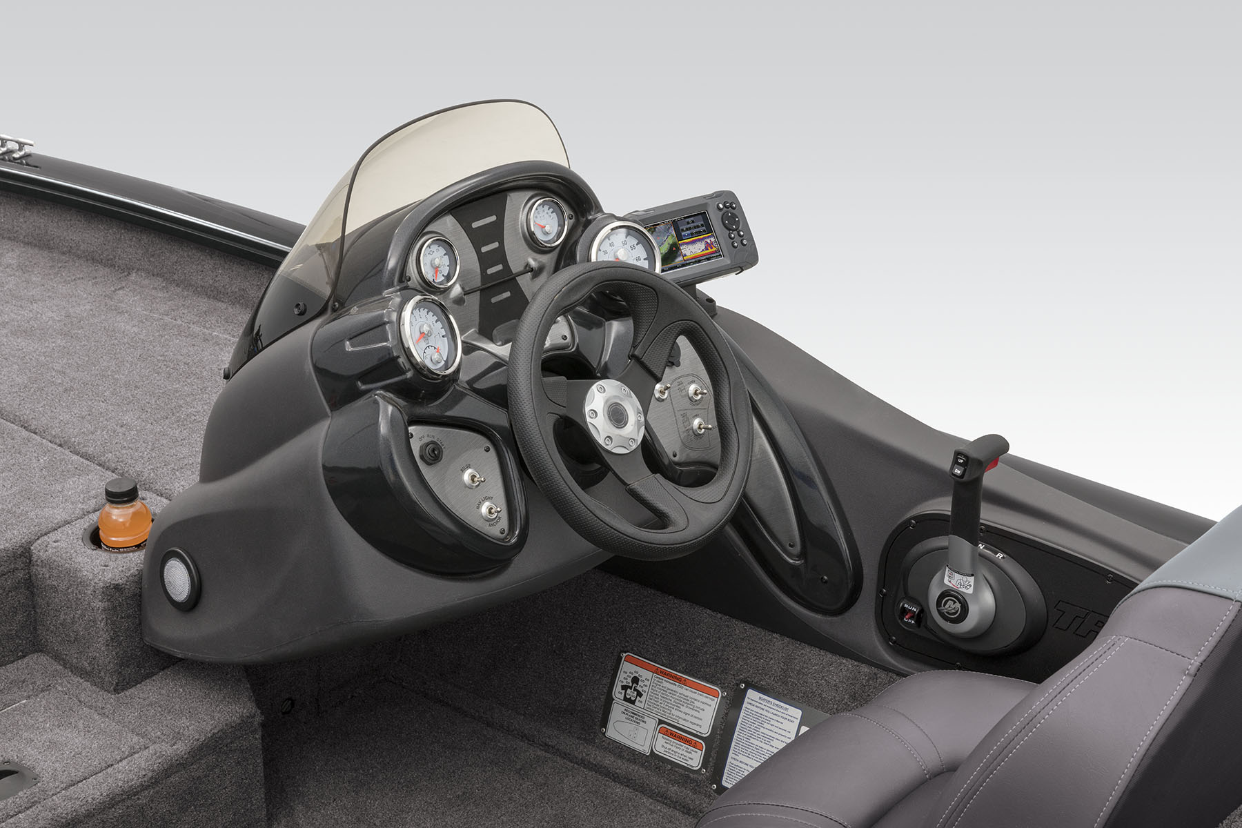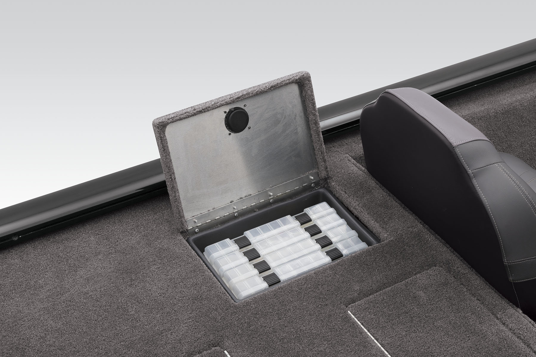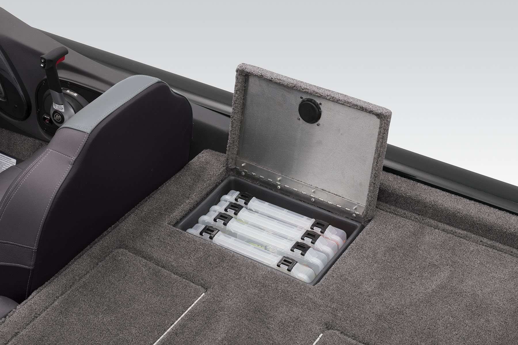 The TRACKER® PRO TEAM™ 190 TX sports a tournament-style deck layout—port and starboard 7’ rod boxes with tip organizers, a giant center bow tackle box and bag organizer, a cooler in the step up to the bow deck flanked by two drink holders.