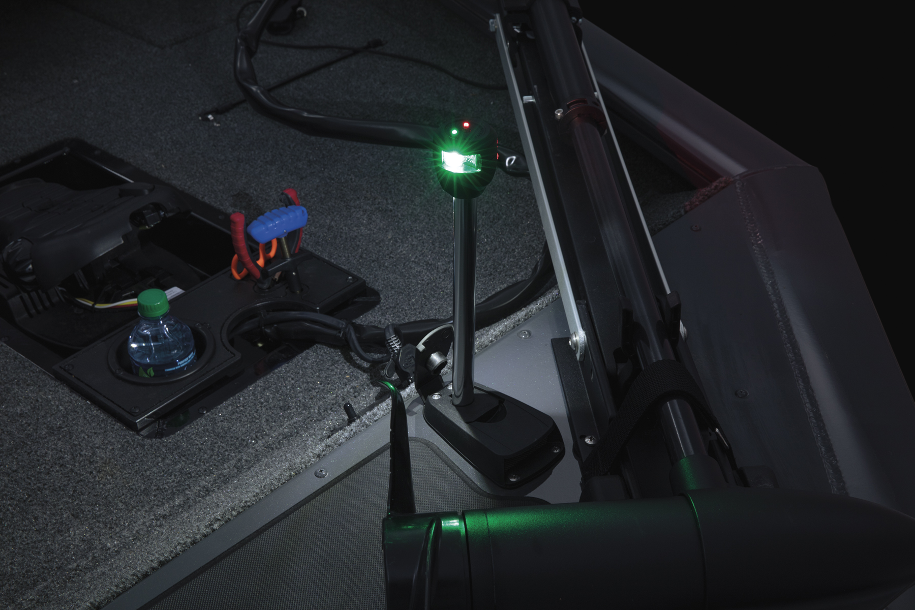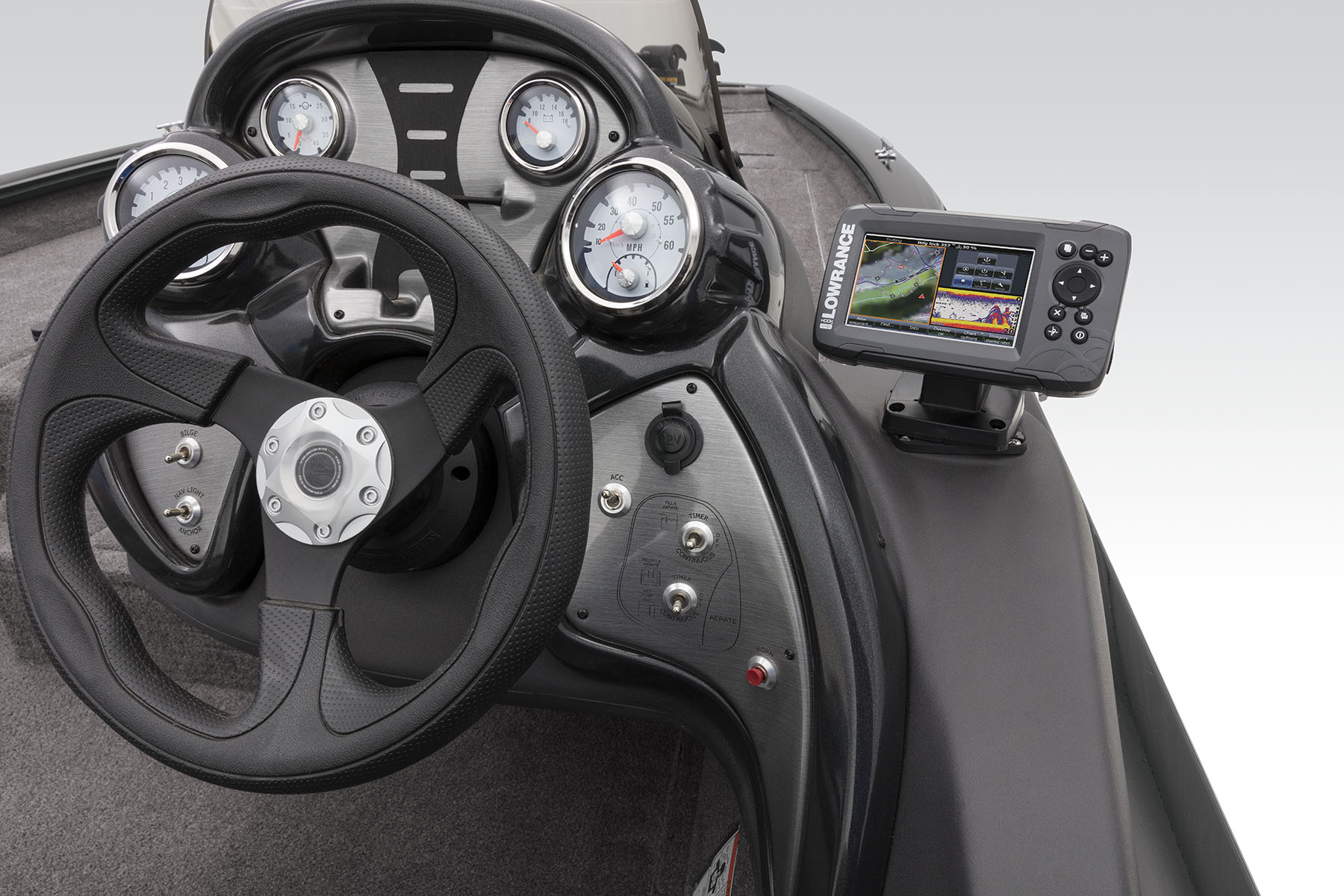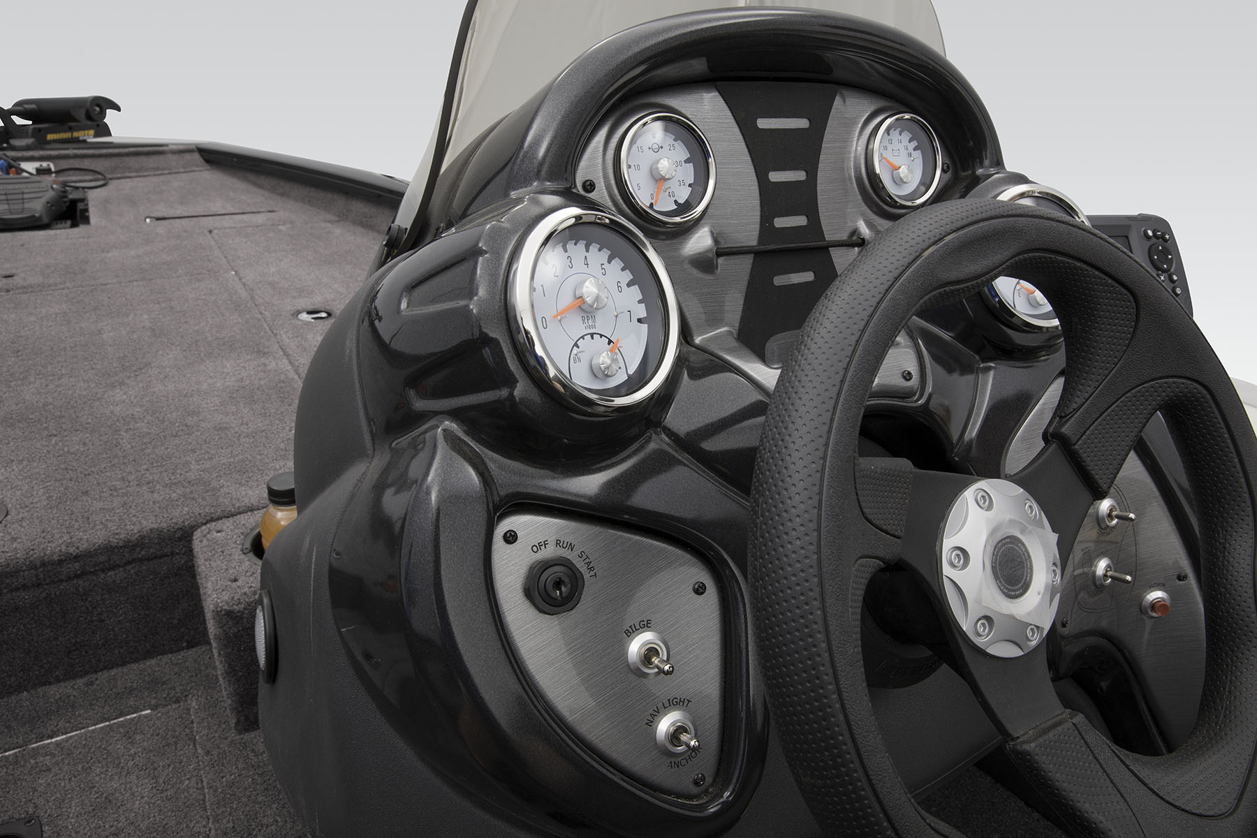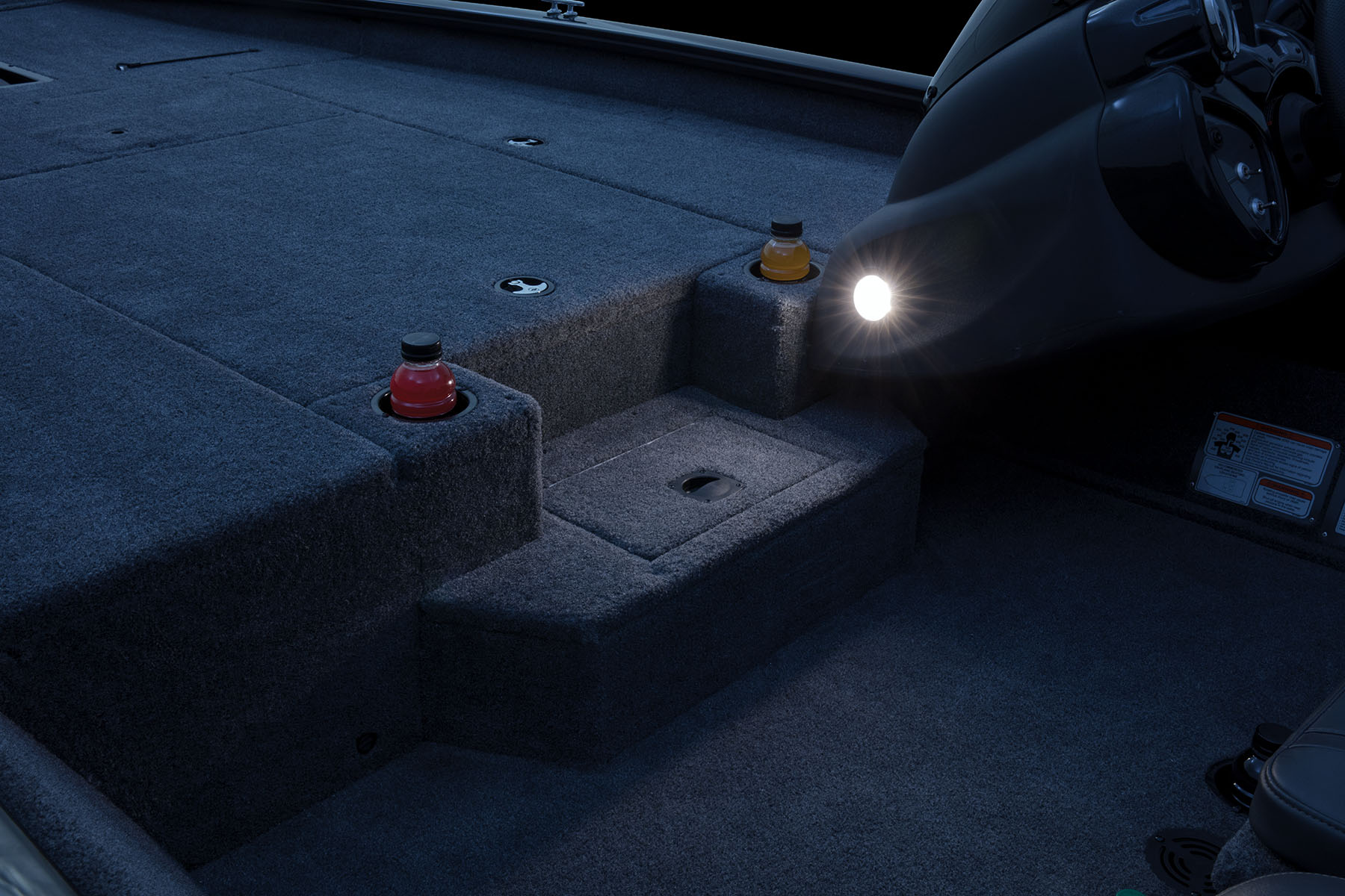 The TRACKER® PRO TEAM™ 190 TX sports a tournament-style deck layout—port and starboard 7’ rod boxes with tip organizers, a giant center bow tackle box and bag organizer, a cooler in the step up to the bow deck flanked by two drink holders.