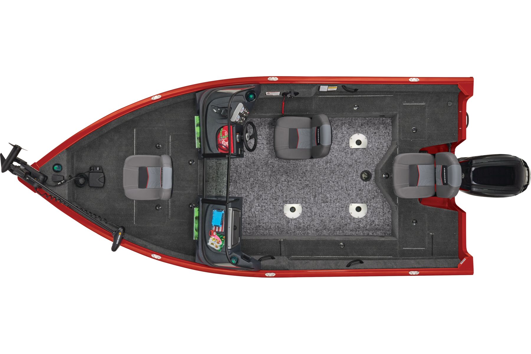 The TRACKER PRO GUIDE V-16 WT packs a punch in a compact, Deep V hull design. The walk-thru windshield shields you from the elements, ensuring comfort in all conditions. With three fishing seats and six customizable setups, the PRO GUIDE V-16 WT is ready for your whole crew. The Deep V hull is sdesigned for smooth, dry performance and peak edge-to-edge stability. It has space galore, so you can haul all your gear with ease. Up front is a standard Minn Kota trolling motor with a livewell/baitwell and twin storage boxes while the console features a Garmin Striker 4 color fishfinder with a full gauge setup and smooth, reliable steering. Rounding out the package are a custom-fitted trailer and reliable, economical four stroke Mercury power.