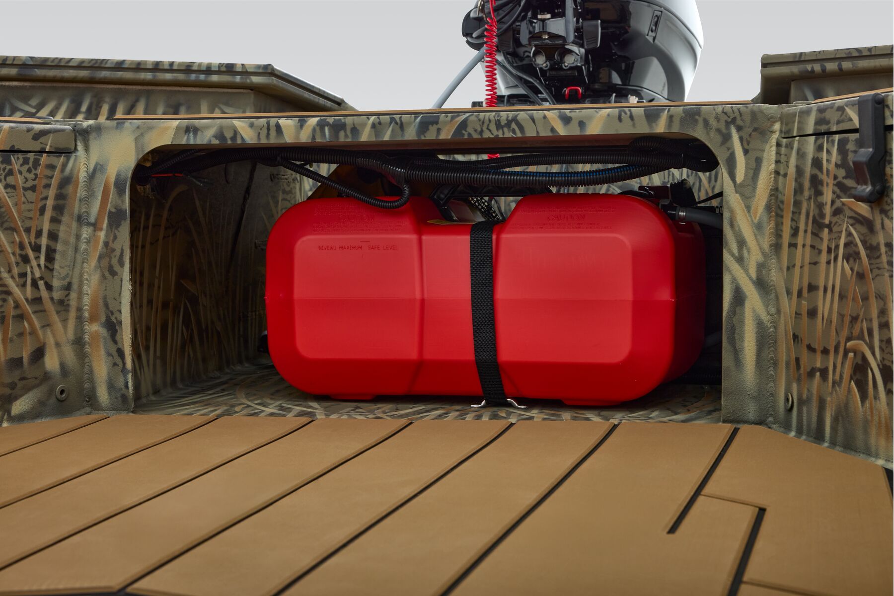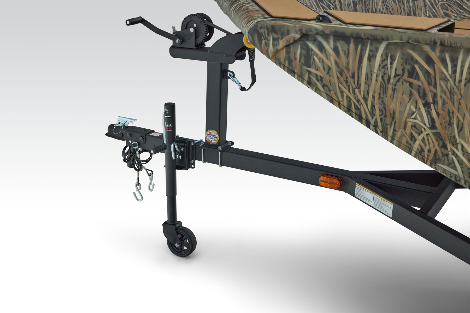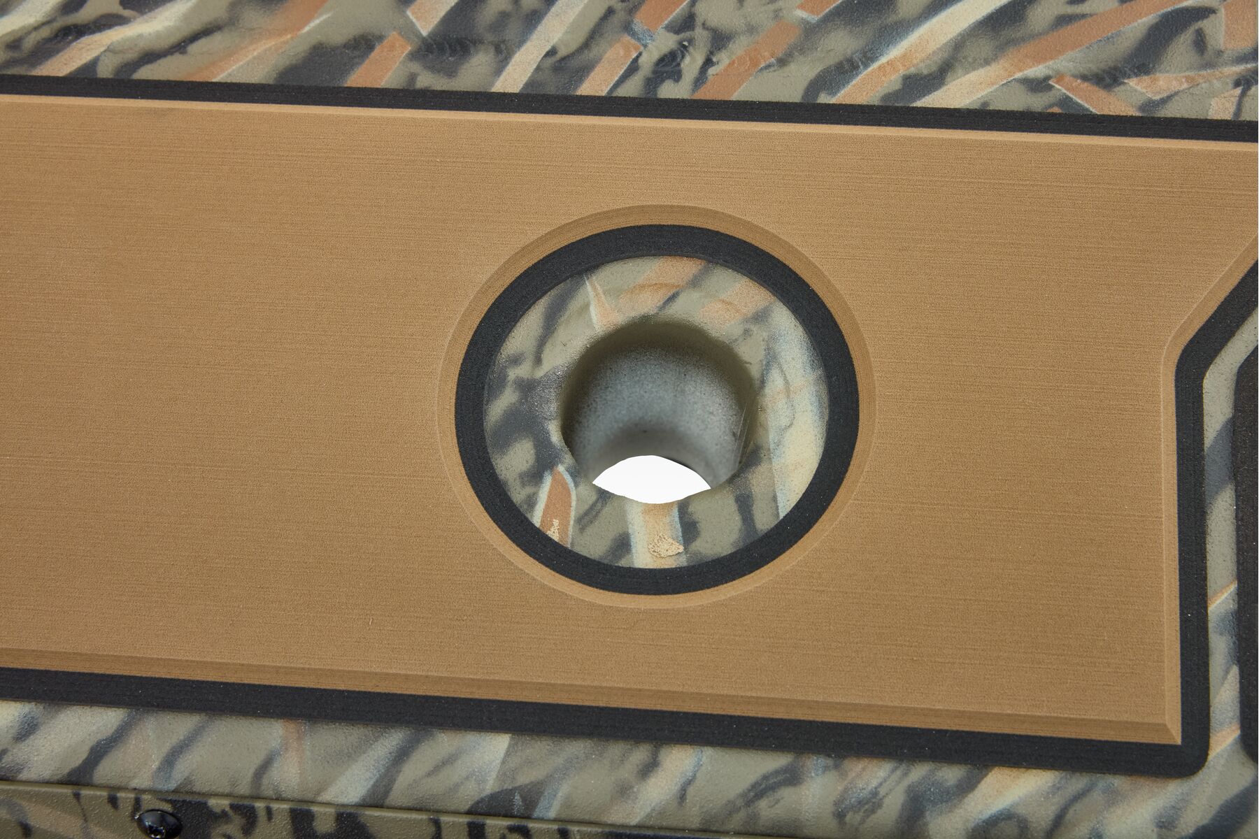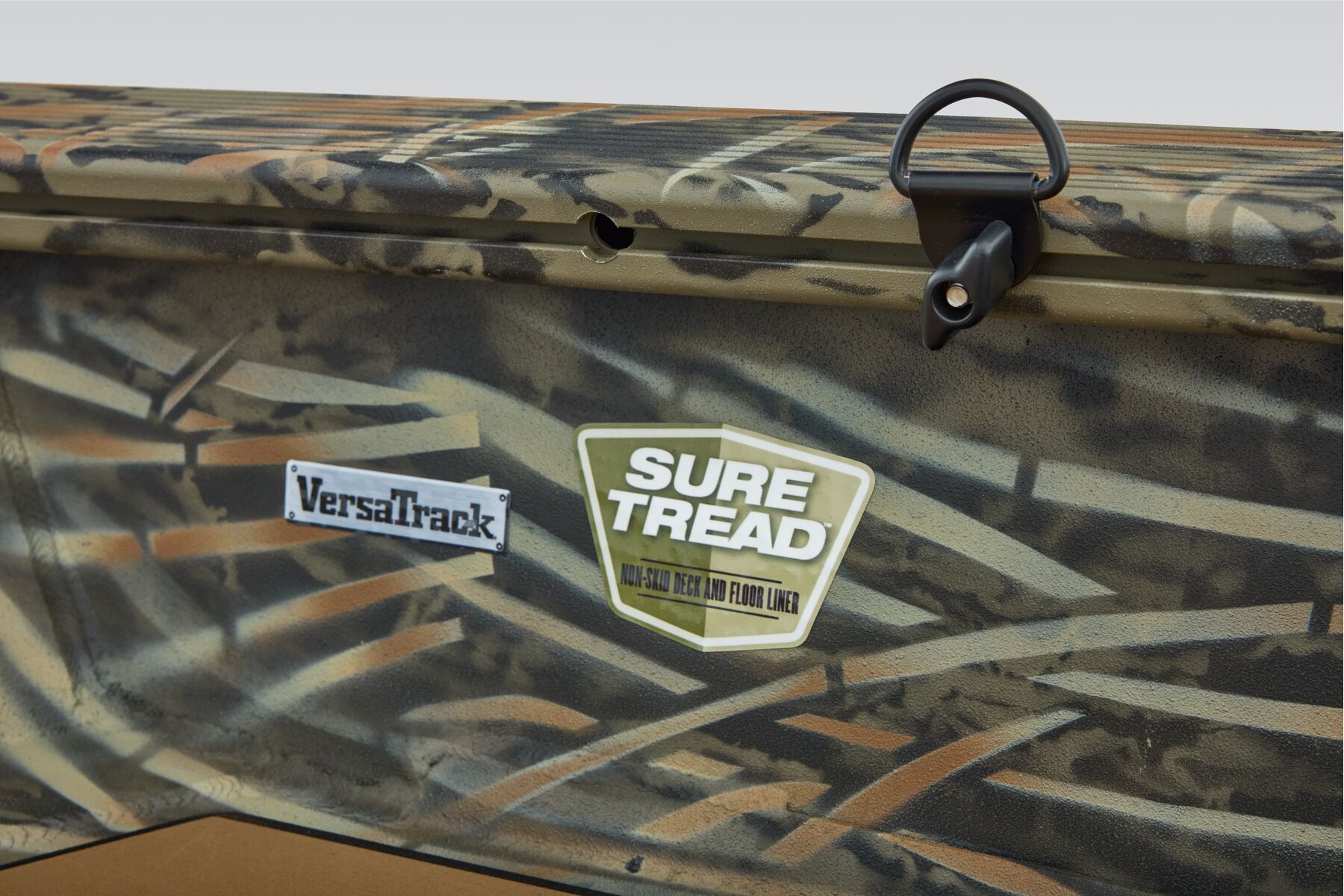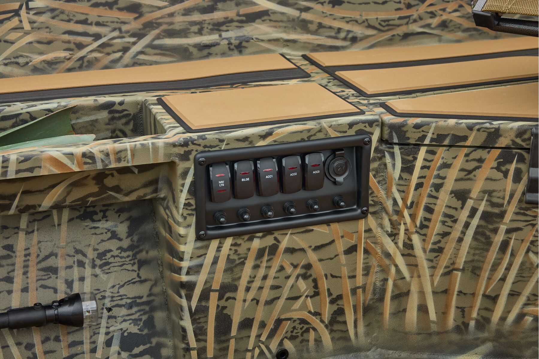 Designed for versatility, it features a spacious front deck ideal for duck hunting, multiple lockable storage compartments, and dry storage in the aft port seat pod. The interior includes Sure Tread™ non-skid flooring for safety and longevity, along with strategically placed tie-down points for gear security. The exclusive VERSATRACK® accessory channel allows customization. Constructed from 100% aluminum with a wood-free transom system, it provides a smooth, dry ride thanks to its 7° deadrise and icebreaker keel. Additional features include integrated spud pole tubes, rear transom steps, and a welded foam-filled interior for strength. Equipped with practical electrical components and a powder-coated trailer, this boat is perfect for die hard waterfowl hunters, and outdoor enthusiasts seeking durability and style in striking Forest Green or TrueTimber® camo patterns.