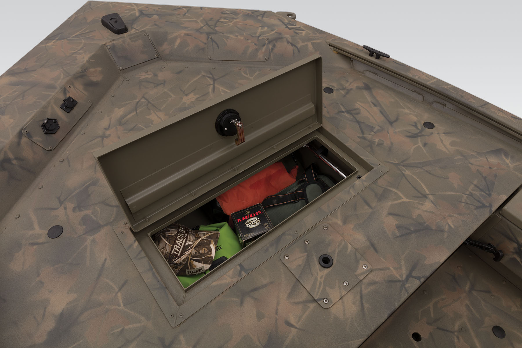 The all-welded TRACKER® GRIZZLY® 1548 T Sportsman is built for waterfowl hunting, but it's great for fishing and bowfishing, too. It sports a lockable bow deck storage compartment, a port rod/gear box, a lockable and removable starboard gun box and integrated sponsons at the transom to improve shallow water performance.