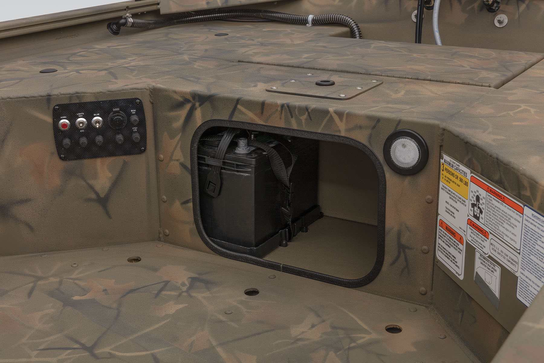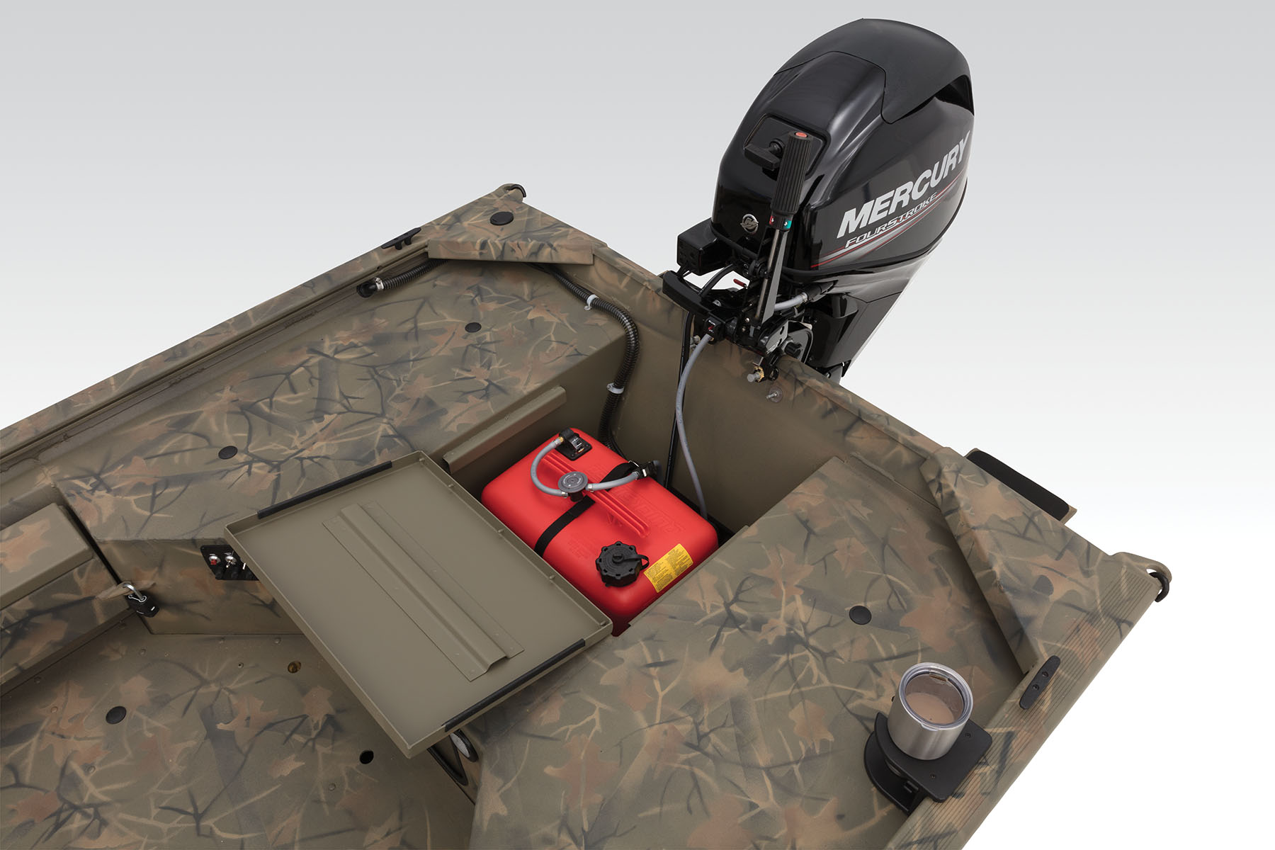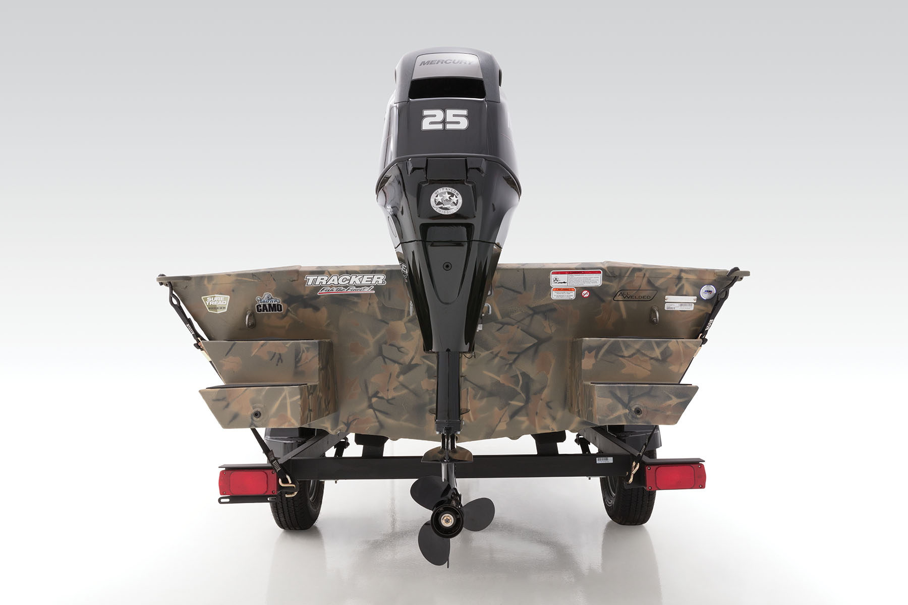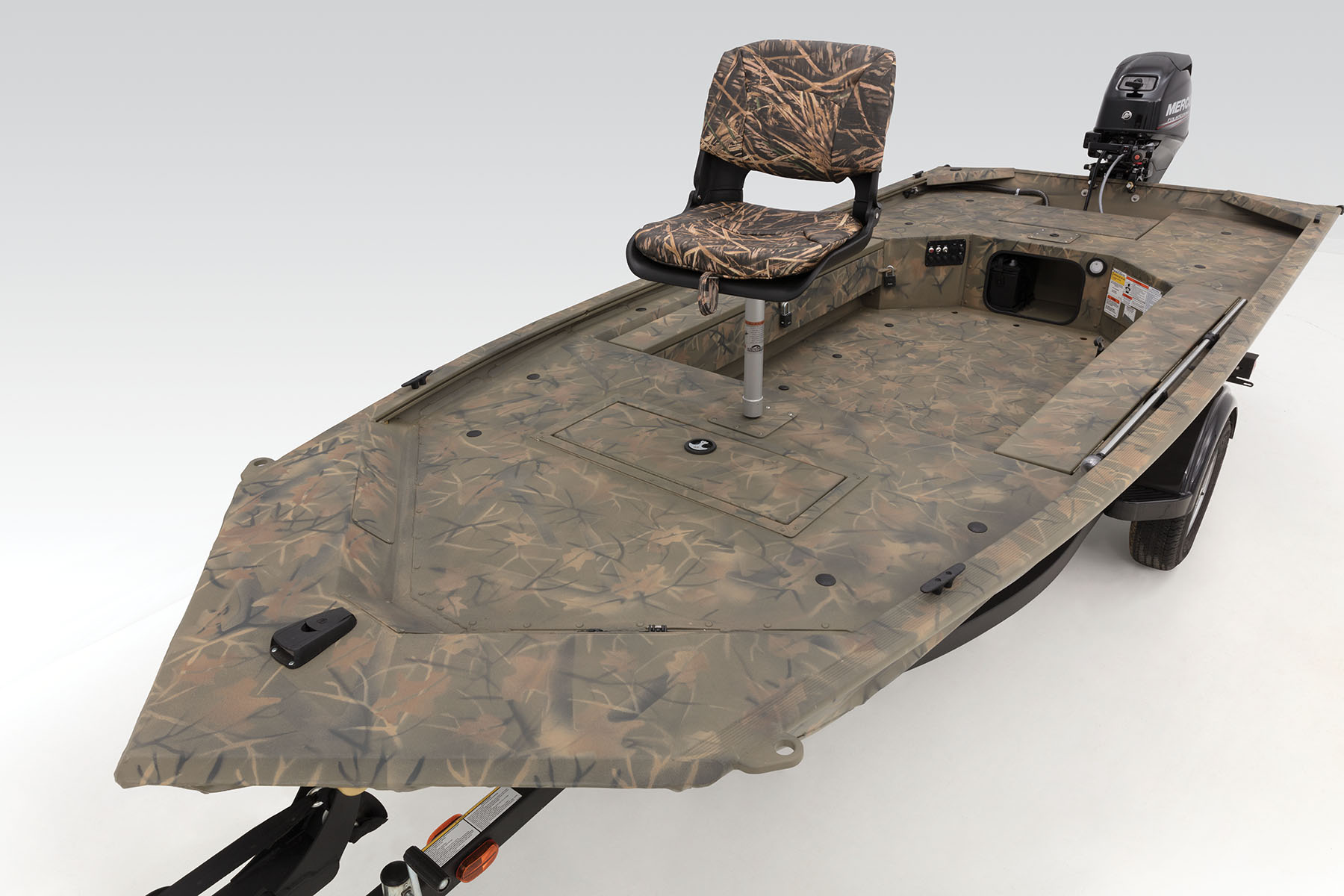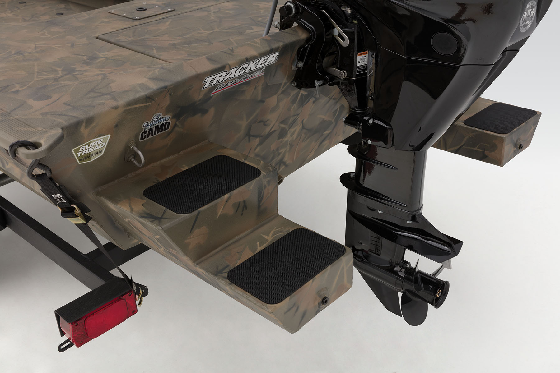 100% aluminum construction with a .100 hull and .190 floor ensures long-lasting durability, and the hull, stringer, transom and decks are all-welded for a rock-solid, unitized structure that can withstand rough fishing and hard work. Because of this, we back it with the TRACKER PROMISE—the best factory warranty in aluminum boats. In addition to the standard Forest Green powdercoat, this model is available in optional Grassland or Woodland camo patterns.